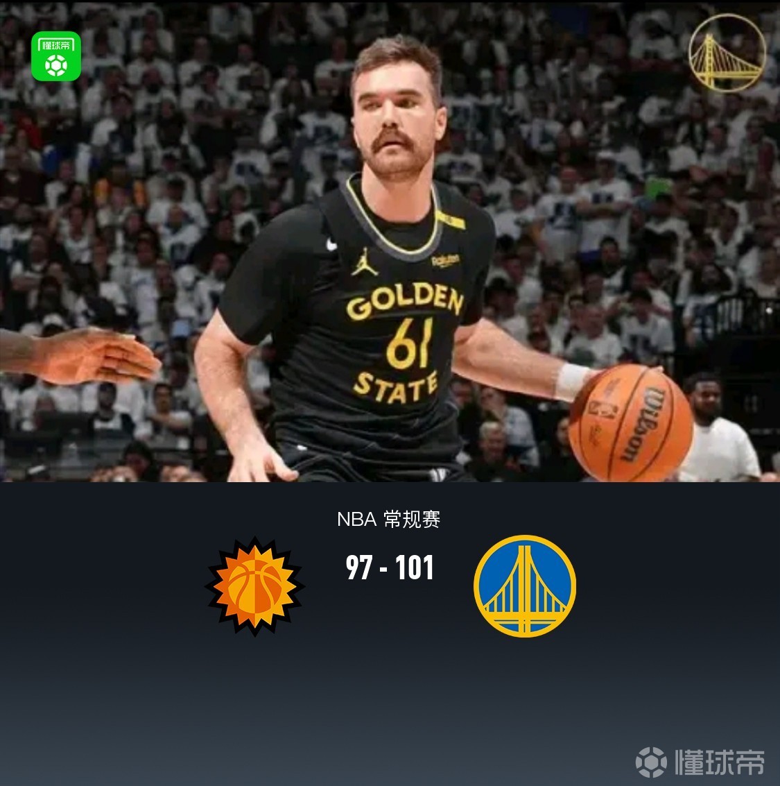 • 勇士101-97末节逆转太阳,斯宾塞20+6,桑托斯18分,狄龙24+6