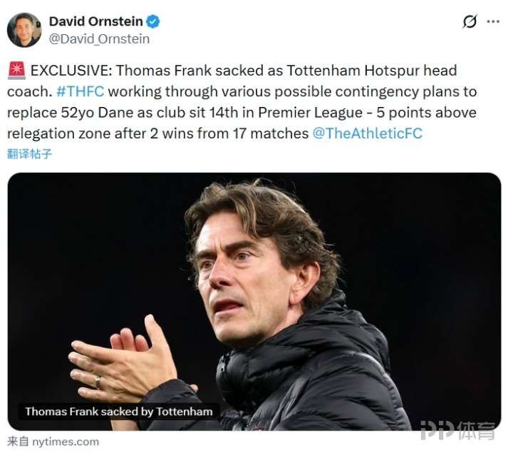 奥恩斯坦表示:“独家消息,弗兰克被热刺解雇,不再担任主教练。 热刺正在研究各种可能的应急方案,以取代这位52岁的丹麦人。”