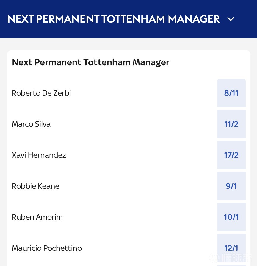 Squawka热刺新帅赔率: